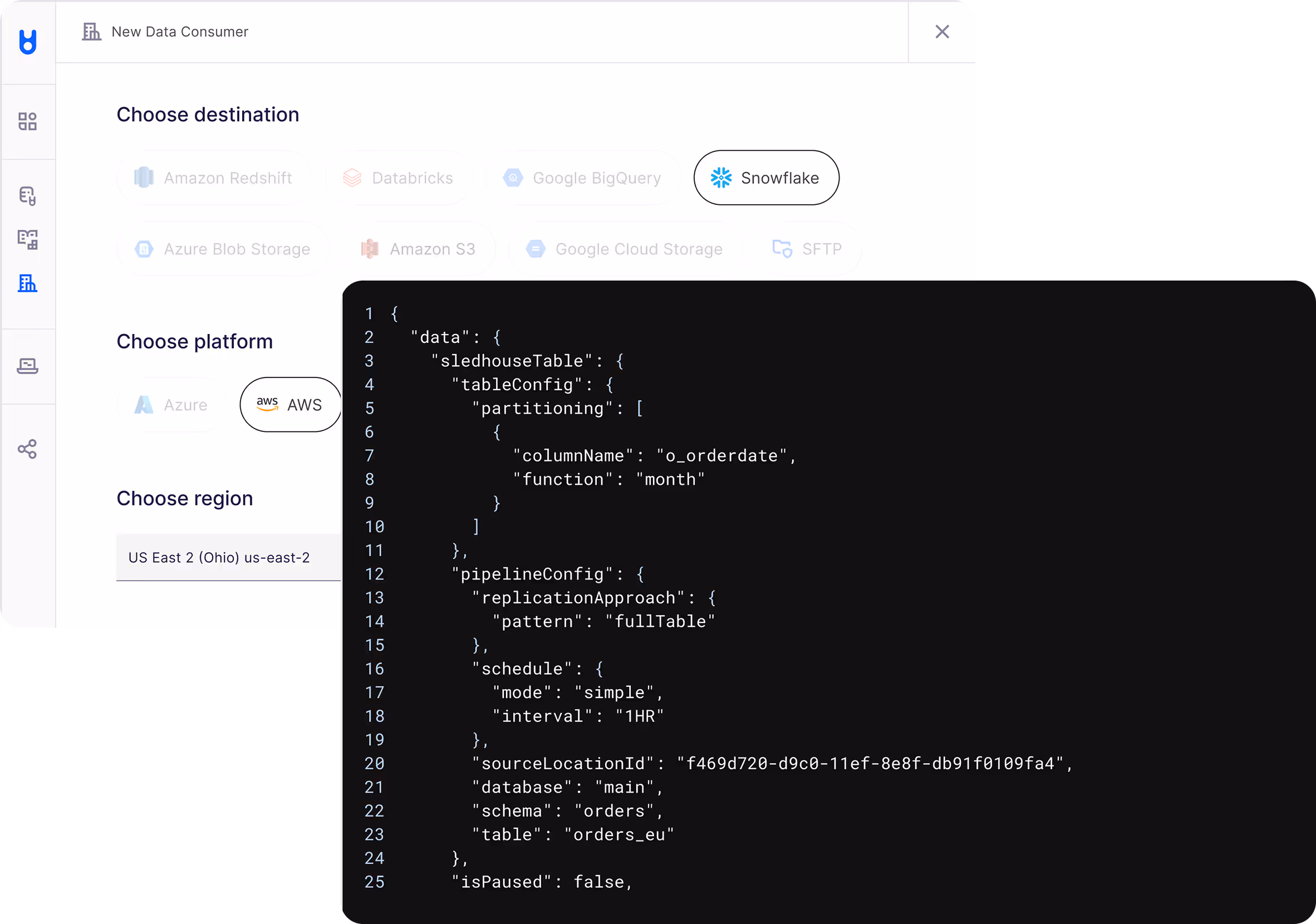 Make data products accessible to customers in their data warehouse, file storage or FTP server without building a single pipeline.